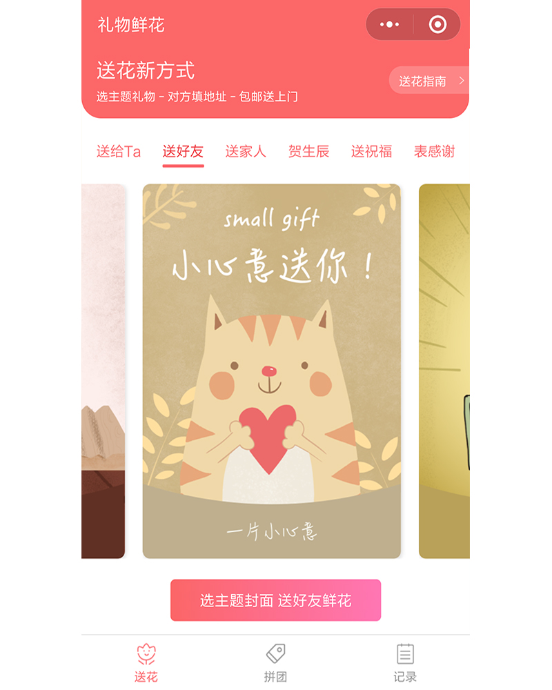 該微信公眾號(hào)是專業(yè)的鮮花網(wǎng)絡(luò)購物平臺(tái),應(yīng)用開發(fā)功能模塊有首頁、拼團(tuán)、記錄等等。
